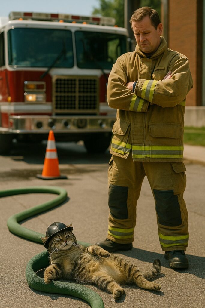 A vertical, realistic photo of a brown tabby cat with black stripes lying sprawled out on the pavement. The cat is entangled in a thick fire hose and wearing a small black firefighter helmet. A male firefighter in full turnout gear stands nearby with his arms crossed, looking down at the cat with an exasperated expression. In the background, a red fire truck and orange traffic cone are visible. It's a sunny day with clear skies and an urban street setting.