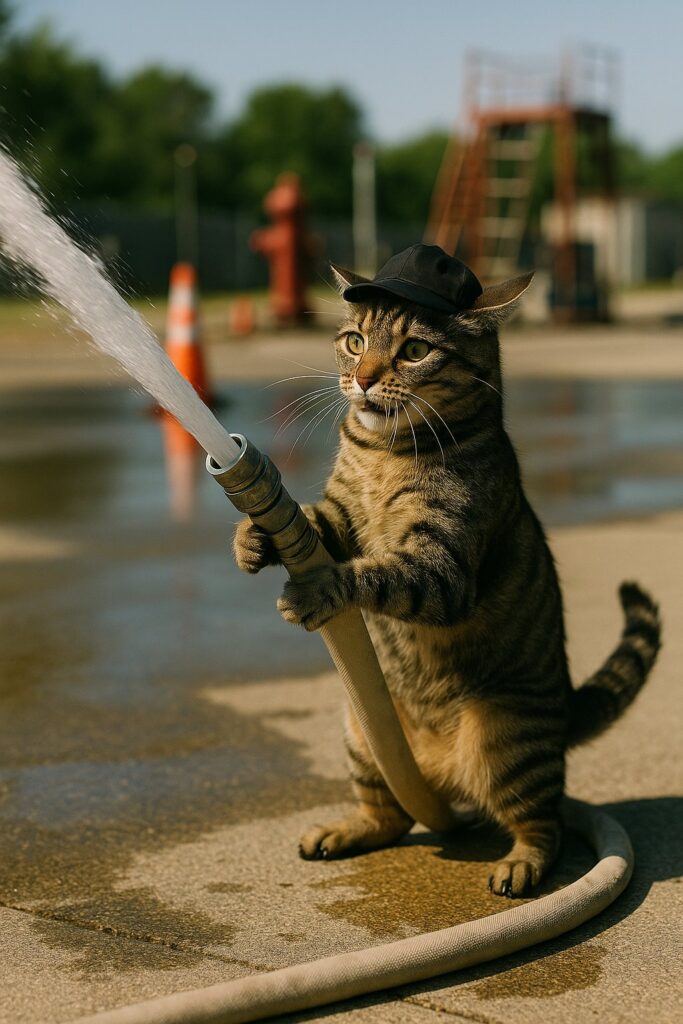 The tabby cat is walking briskly on two legs while carrying a fire hose tucked under one arm. The outdoor training ground is visible in the background. The cat looks serious and determined. Footsteps can be heard softly on concrete, along with the faint dragging sound of the hose. Occasional wind or distant sirens may be audible in the background.