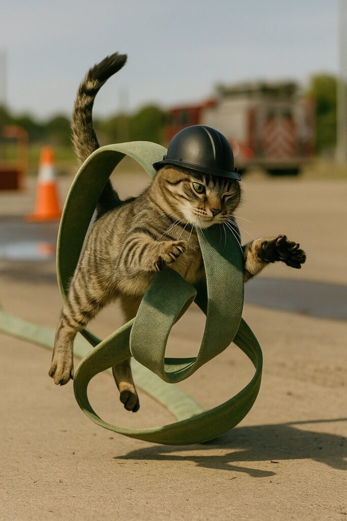 A close-up photograph of a brown tabby cat wearing a black firefighter helmet, awkwardly stumbling over a green fire hose on sunlit cracked pavement. The cat’s eyes are closed in a moment of clumsy surprise. In the background, a red fire truck and orange traffic cones suggest an urban American firefighting scene. No clothes besides the helmet.