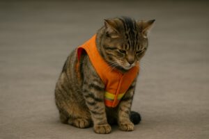 A brown tabby cat stands upright on a suburban sidewalk during the day, wearing a red vest and a red cap that resembles casual safety gear. The cat looks around with a serious expression, as if preparing for a task. A small red cone or toy hydrant is placed nearby for context. The environment includes quiet American houses and trees. Add ambient outdoor sounds like birds chirping and distant traffic. No background music.