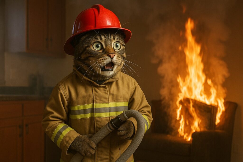 A horizontal, realistic photo-style image. A tabby firefighter cat with a red helmet and tan uniform is inside a burning house, looking surprised as it sees fire in the room. The cat is holding a coiled fire hose and stands in front of flames that are consuming part of the wall or furniture. Smoke fills the air. The scene is tense but slightly humorous due to the cat’s shocked expression.