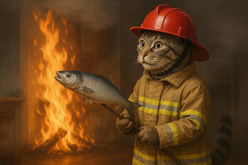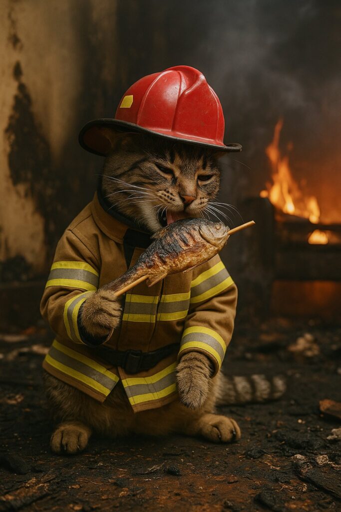 The firefighter cat sits on the burnt floor, holding a skewer with grilled fish and eating happily. Smoke drifts through the background, with scorched walls and debris around. The cat looks completely satisfied.