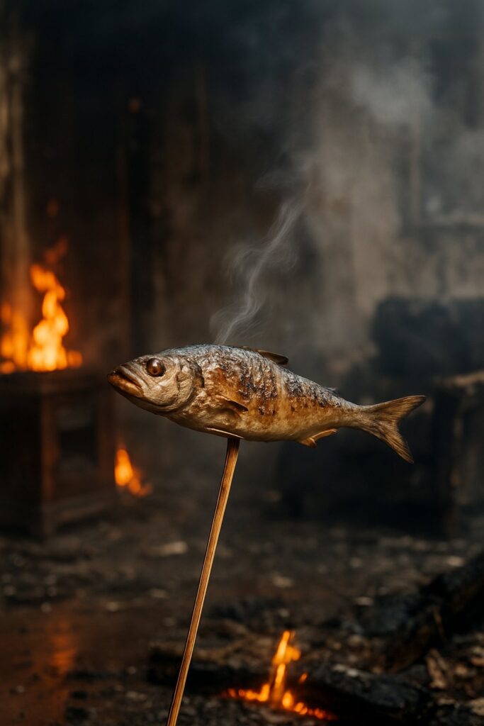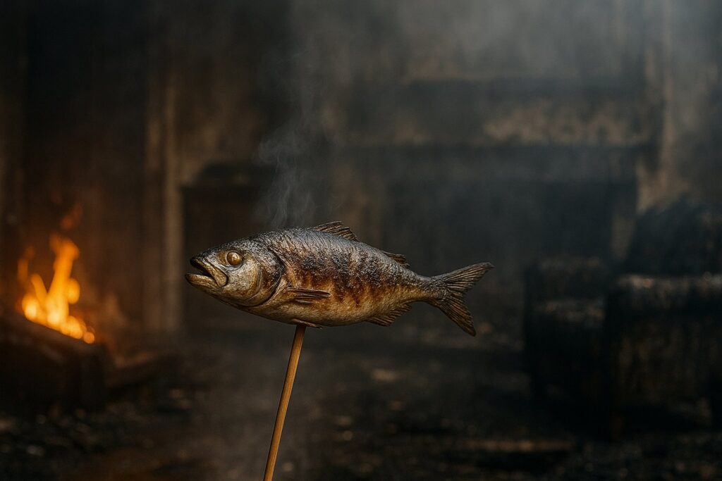 A horizontal, realistic photo-style image. In the burnt remains of a house interior, a grilled fish on a skewer is revealed as the smoke dissipates. The room has charred walls, blackened furniture, and lingering haze in the air. The fish is in focus, steaming and lightly browned. No cat is present.