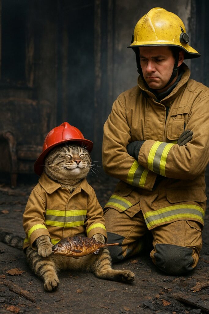 A vertical, realistic photo-style image. Inside a burnt American house, a tabby cat dressed as a firefighter (red helmet, tan uniform with reflective stripes) is sitting contentedly, having just finished eating a grilled fish. The cat looks very satisfied. Next to the cat stands a human firefighter with light skin and dark hair, wearing a standard yellow turnout coat and helmet, looking down at the cat with a disappointed or exasperated expression. The background shows charred furniture and light smoke.