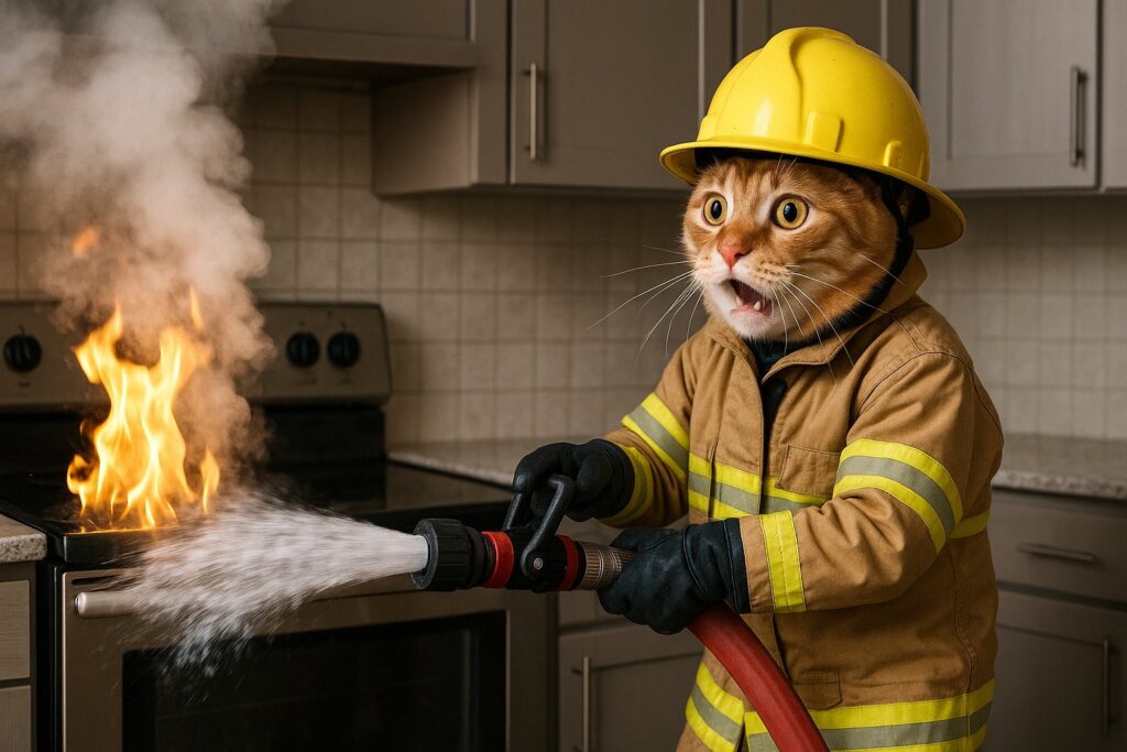 A horizontal, realistic photo-style image. In a smoky modern kitchen, a tabby cat dressed as a firefighter is using a hose to spray water across the room. The cat wears a red helmet and a tan firefighter jacket with reflective stripes. Its eyes are focused, and it grips the hose with both paws. Water splashes in the air, and thick smoke lingers throughout the scene. The origin of the smoke is still unclear.