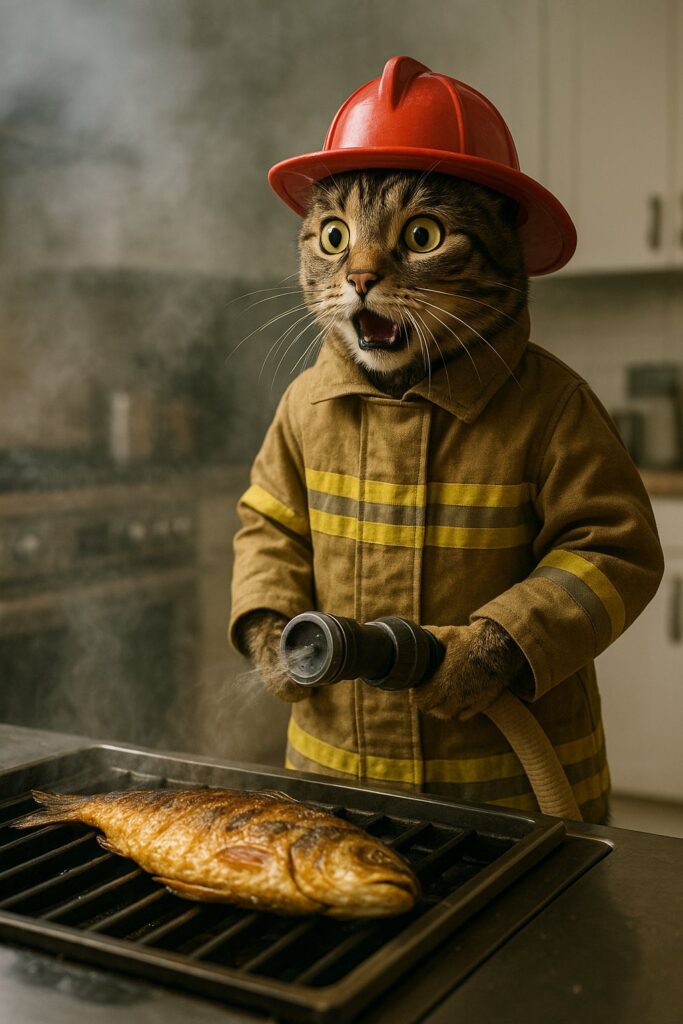 A vertical, realistic photo-style image. In a kitchen filled with fading smoke, a firefighter tabby cat wearing a red helmet and tan uniform stares in surprise at a grilled fish on the stovetop. The cat stands upright, holding a hose, with wide eyes and a shocked expression. The fish is golden brown and steaming, resting on the grill. The background shows kitchen counters and appliances, and only light smoke remains.