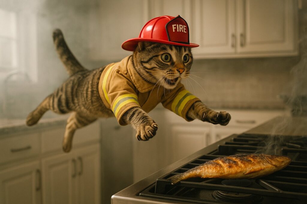 A horizontal, realistic photo-style image. A tabby cat with black stripes, dressed in a red firefighter helmet and a tan firefighter uniform with reflective stripes, is mid-air inside a smoky American kitchen. The cat is jumping toward a golden, steaming grilled fish on a stovetop. Its front paws are stretched forward, and its eyes are wide with excitement. The kitchen background shows some lingering smoke and modern appliances.