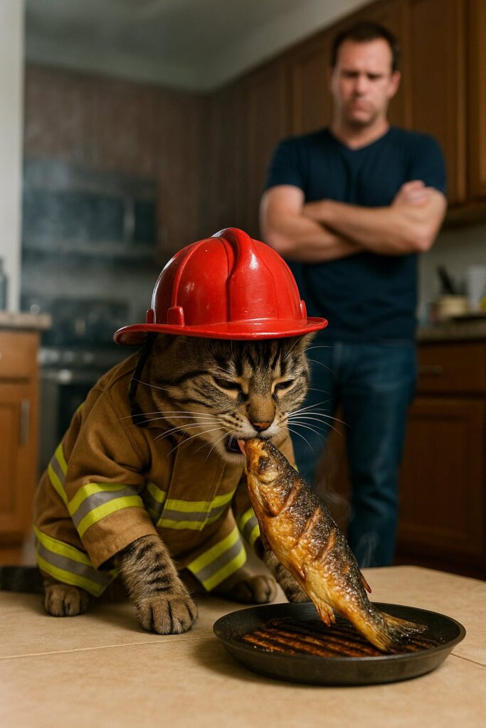 A horizontal, realistic photo-style image. In a modern American kitchen, a tabby cat with black stripes, dressed in a red firefighter helmet and tan jacket, is sitting on the floor, eagerly devouring a steaming grilled fish. The cat looks completely focused on the food. Behind the cat, a human with light skin stands with arms crossed, staring at the cat with a frustrated expression. The kitchen is slightly messy, with no smoke in the air.