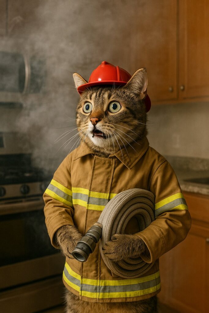 A vertical, realistic photo-style image. Inside a suburban American kitchen, a firefighter tabby cat stands on its hind legs, wearing a red helmet and tan jacket. The cat holds a coiled hose and looks shocked, with wide eyes and raised eyebrows. Thick gray smoke fills the air in the kitchen, but the source of the smoke is not visible. Stainless steel appliances and cabinets are visible in the background.