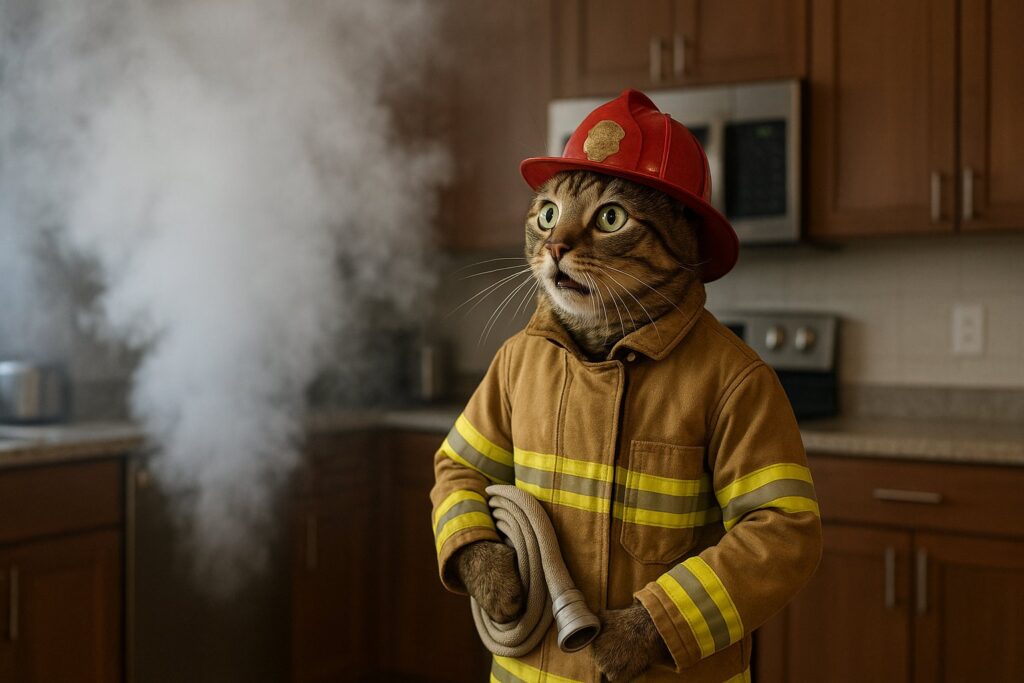 A horizontal, realistic photo-style image. A tabby cat dressed as a firefighter is standing on two legs inside a smoky American kitchen. The cat wears a red helmet and a tan jacket with reflective stripes, and holds a coiled fire hose under one arm. The cat has a shocked expression, with wide eyes, as it looks toward thick gray smoke rising inside the room. The source of the smoke is not visible. The background shows modern kitchen cabinets, counters, and appliances.