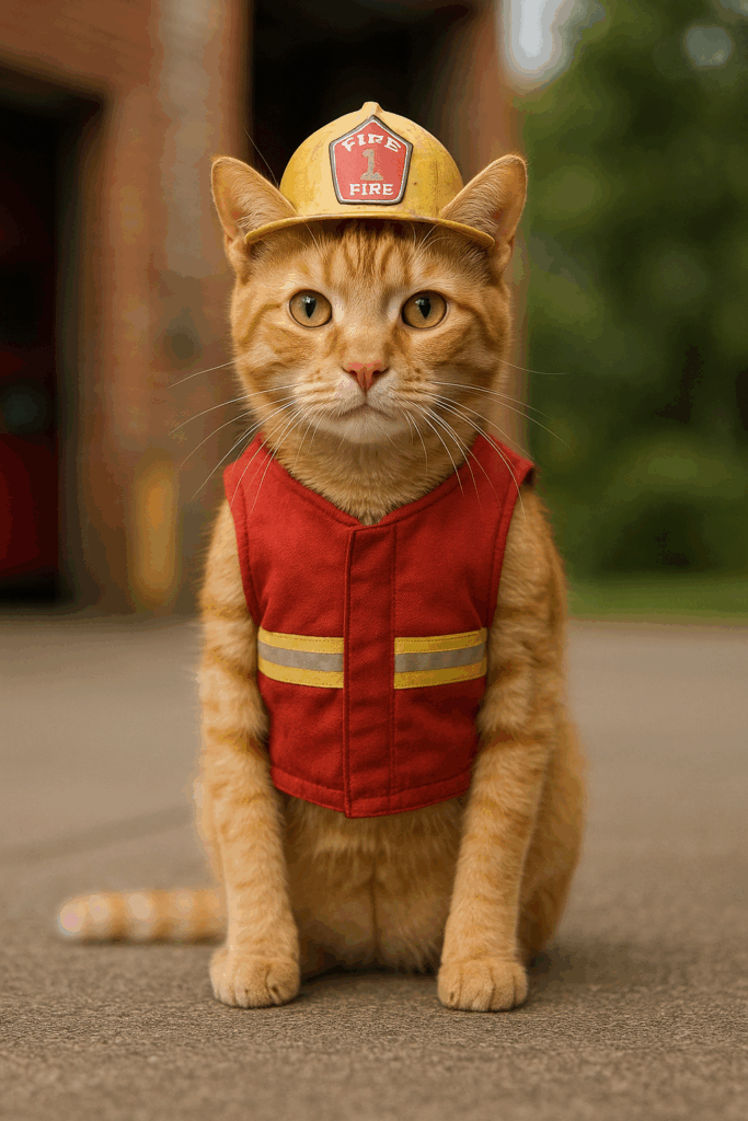 This sample shows our firefighter cat with key costume elements: helmet, red vest, and an alert pose.