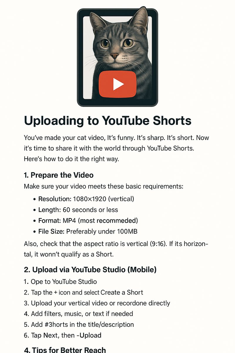 You’ve made your cat video. It’s funny. It’s sharp. It’s short. Now it’s time to share it with the world through YouTube Shorts. Here’s how to do it the right way. 1. Prepare the Video Make sure your video meets these basic requirements: Also, check that the aspect ratio is vertical (9:16). If it’s horizontal, it won’t qualify as a Short. 2. Upload via YouTube Studio (Desktop) 3. Upload via YouTube App (Mobile) 4. Tips for Better Reach Final Thoughts YouTube Shorts are an easy and fast way to grow your channel. With regular uploads and good quality, you’ll build an audience quickly—especially if your cat eats a fish in … Continue reading Uploading to YouTube Shorts
